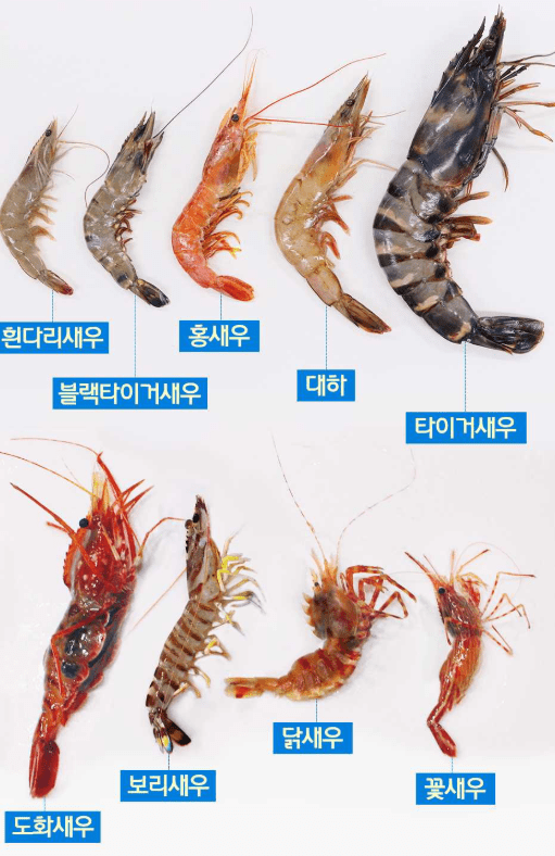 또한 민물새우 및 바다새우가 있으며 열대에서 한대에 걸쳐 널리 분포하며, 크기에 따라 대하(大蝦), 중하(中蝦), 젓갈용의 소형새우(젓새우) 등으로 나눌 수 있는데, 주로 서해와 남서해에서 잡힌다고 합니다.